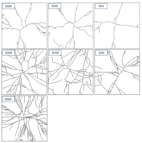 Specimens under the first impact load were shown to present radial and radioactive cracking, with crack widths occurring from 0.05 to 0.15 m. The completion of the second impact load brought forward the evidence of diagonal fractures, more specifically in the specimens strengthened by 5 or 10 mm of HSDC (H5D, H10D). The fourth and fifth drop blows saw crack widths of 5.00 mm and 5.50 mm in H5D and H10D, respectively. Unsurprisingly, the H20D sample that had the largest HSDC thickness was the most resilient when considering impact loading. Furthermore, the cracking patterns observed on the bottom side of the test specimen demonstrated hairline crack widths as the primary form of cracking, with a width of approximately 0.05 mm after the first impact. Crack widths of 0.70 and 1.10 mm were measured after the fourth and fifth blow, respectively, and were seen to be the maximum crack widths at that time. In comparison to the H5D and H10D samples, the strengthening materials in H20D were more successful in controlling and mitigating crack growth. The sixth impact load resulted in new deformation to the specimens on their underside, showing fibers bridging the pre-existing large diagonal cracks; additionally, wide diagonal cracks presented, originating in the center of the specimen, and ending at its edges. Large diagonal cracks resulting from fracturing are reproduced in Figure 10.