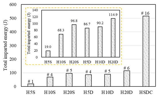 Furthermore, the influence of the number of strengthening layers and thickness on the impact capacities of specimens, using total imparted energy, is shown in Figure 11. The total imparted energy increased with strengthening thickness, no matter the strengthened specimen, whether it was single- or double-layered. In contrast, the double-layer sample strengthened with HSDC resulted in a significant increase of impact capacities, with the total energy imparted to the H20D specimen being more than five times and 3.5% larger than that imparted to the H5S and H5D specimens, respectively. The increased impact resistance properties of the specimens correlated with the strengthening side numbers and thickness; similar strength trends were obtained for specimens at 20% strengthening area ratios. This was presumably because the strengthening thickness of the specimen increased fiber contents; thus, as determined in previous research, concrete reinforced with fibers exhibited smaller displacement amplitudes under impact loading and was able to undergo larger displacements and reaction force amplitudes before failure [11,19].