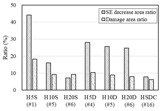 As found in previous research [6,20], the SE of the concrete specimen is mainly influenced by effective thickness variation, which is effective against external loads or environmental factors. Thus, the SE capability was evaluated for the specimens after low-velocity drop-weight tests in this study, using the SE decrease ratio versus the damage area ratio (which included the crack and scabbing area), as shown in Figure 12.