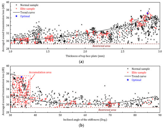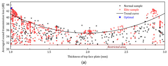 (1) Together with Raleigh’s Integral, a vibro-acoustic optimization is performed by using the genetic algorithm to maximize the frequency averaged sound transmission loss (STLavg) of the sandwich panel in three different frequency bands.