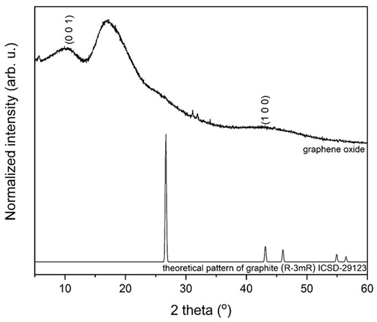 The formation of the graphene oxide powders was followed by the powder XRD measurements (see Figure 1). The obtained pattern was correlated with the reference standard of the graphite that was used as a substrate, ascribed to the R-3mR space group from Inorganic Crystal Structure Database (ICSD-29123). In the case of pure graphite, a diffraction peak around 26° corresponds to the highly organized layer structure (0 0 2 plane). This diffraction peak is very small on the diffraction pattern, which is related to only to a small amount of graphite in the obtained product. Moreover, the diffraction peaks at 2θ = 11° (0 0 1 plane) and at 2θ = 42.7° (1 0 0 plane) were observed confirming the formation of graphene oxide. In this case, the diffraction peak derived from 0 0 1 plane is shifted towards higher value of 2θ angle that can be related to the lower oxidation degree of graphene [28]. It was also observed that the broad and intensive diffraction peak at 2θ = 17° is consistent with the data reported by Saladino et al. [29].