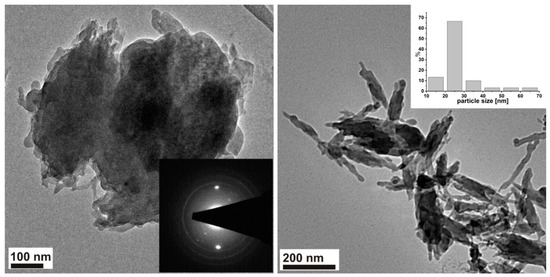 Figure 2 shows the TEM images with the SAED pattern as well as particle size distribution for the obtained sample. The SAED pattern shows a ring-like pattern which indicates that the examined agglomerate is a set of smaller crystalline objects with a random orientation to the electron beam (the polycrystalline nature of the sample). The diffraction pattern differs slightly from those presented in the literature for pure GO because other carbon structures may also be present in the materials, which was observed by other authors [28,29].