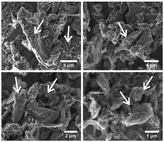 SEM images of graphene oxide material. The arrows showed particularity of obtained graphene oxide.