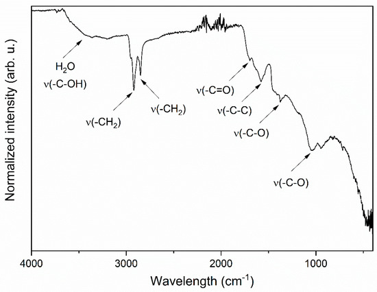 The infrared spectra of the obtained graphene oxides are presented in Figure 4. The FTIR spectrum of GO shows a broad peak at about 3200 cm−1 in the high frequency area corresponding to the stretching vibration of the -C-OH groups and water molecules adsorbed on graphene oxide. The peaks at 2920 cm−1 and 2853 cm−1 belong to the symmetric and anti-symmetric stretching vibrations of -CH2 groups. The peak at 1698 cm−1 is related to the stretching vibration of -C=O groups, at 1580 cm−1 with the -C-C stretching and at 1375 cm−1 with the -C-O stretching vibration of carboxylic acid. The peak at 1051 cm−1 is attributed to the -C-O bond. The presence of different kinds of oxygen functionalities in the obtained material was detected, which confirmed the formation of graphene oxide. Moreover, these polar groups, especially the surface hydroxyl groups, occur in hydrogen bonds formation between GO and water, which clarifies the hydrophilic nature of graphene oxide [28,32,33,34].