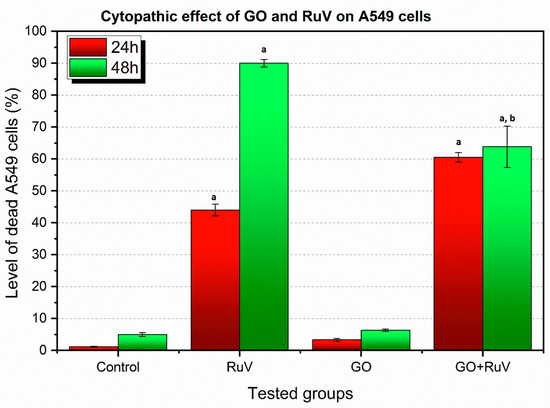 Percentage of cytopathic effect in A549 cell line. RuV—cells infected with RuV, GO—cells with graphene added, GO + RuV—cells infected with RuV and with graphene added. Statistical significance at p < 0.05, a: when compared to control group; b: when compared to RuV group.