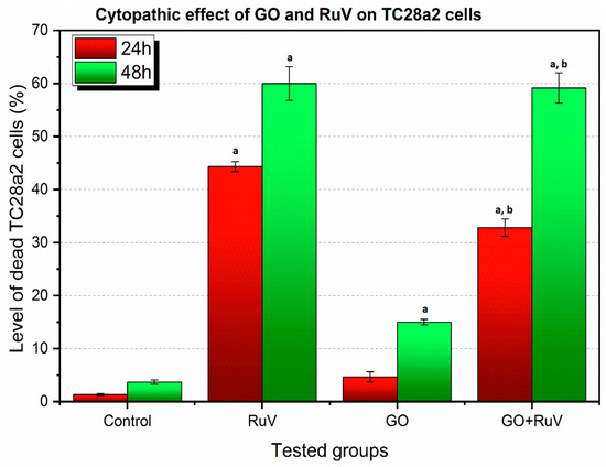 Percentage of cytopathic effect TC28a2 cell line. RuV—cells infected with RuV, GO—cells with graphene added, GO + RuV—cells infected with RuV and with graphene added. Statistical significance at p < 0.05—a: when compared to control group; b: when compared to RuV group.