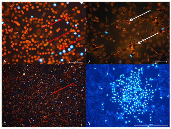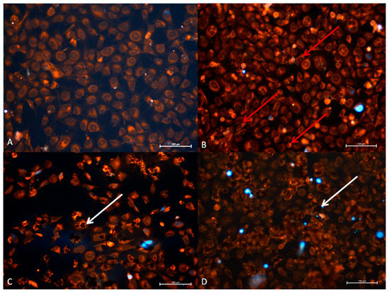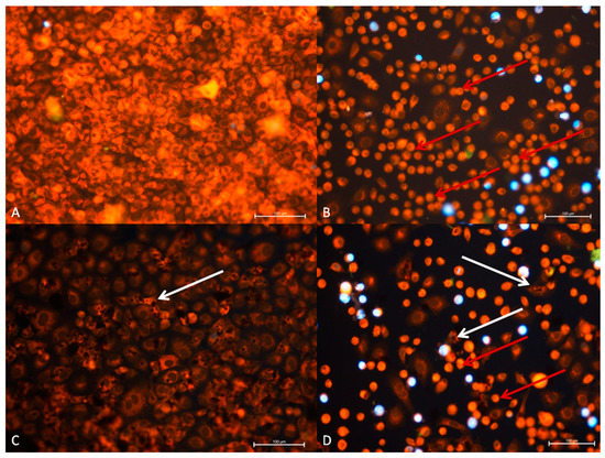 TC28a2 cell line 24 h after administration of virus and GO. (A) Control group, (B) RuV group, (C) GO group, (D) GO + RuV group. Mild cytopathic effect in cells with changed morphology (red arrow) after RuV administration is visible (red arrow).Visible graphene covering cells (white arrow) in both GO and GO + RuV treated cells. DAPI and Rhodamine B. Mag 100x. Scale bar 100 µm.