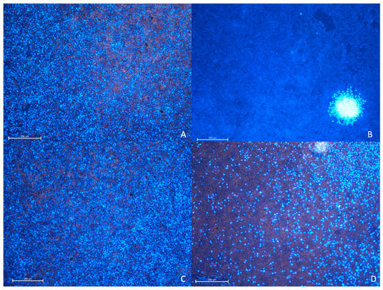 A549 (ATCC-CCL-185TM) cell line 48 h after administration of virus and GO. (A) Control group, (B) group RuV, (C) GO group, (D) GO + RuV group. Different ability of DAPI uptake (blue dots) by cells. In RuV48 group visible arrangement of surviving cell in a colony manner. Other cells showed cytopathic effect. In other GO groups, visible similar level of responding cells in comparison to the control group. In GO + RuV group about 50% of cells are not responding due to virus infestation. DAPI and Rhodamine B. Mag 40x. Scale bar 200 µm.