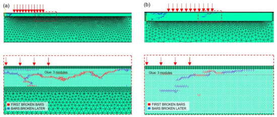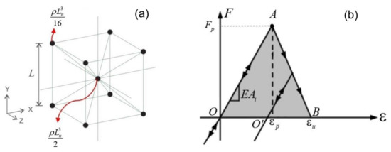 where the vectors and represent the nodal acceleration and velocity, respectively; and are the mass and damping matrices, respectively; and the vectors and are the internal and external nodal forces, respectively. As matrices and are diagonal, the Equation (3) are not coupled, and can be easily integrated in the time domain using an explicit finite difference scheme. In this way, the nodal coordinates are updated at each time step, and thus large displacements are accounted for without introducing any modification in the formulation [46]. By considering such an aspect, discrete element method is different from finite element method, in which a suitable nonlinear formulation, such as Lagrangian or total Lagrangian [47], should be employed.