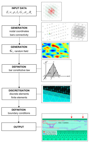 - Puglia, V.B.; Kosteski, L.E.; Riera, J.D.; Iturrioz, I. Random field generation of the material properties in the lattice discrete element method. J. Strain Anal. 2019, 54, 236–246. [Google Scholar] [CrossRef]