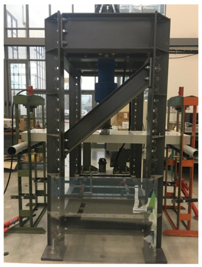 Now, the flexural behaviour of sandwich panels is experimentally examined. Three-point bending tests have been carried out at the Materials and Structures Testing Laboratory of the University of Parma, in accordance with the ASTM C393/C393M, ASTM D7249/D7249M, and ASTM D7250/D7250M standard specifications [58,59,60]. The tests have been performed by means of an electronically controlled hydraulic machine with a capacity of 200 kN (Figure 3).