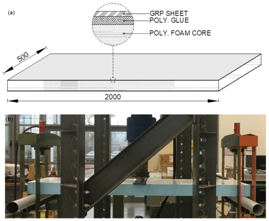 The sandwich panels consist of extruded polystyrene foam core (with a thickness equal to 100 mm) between two thin sheets (also named skins) of fiberglass composite material GRP (each sheet with a thickness equal to 1.5 mm). The Young’s modulus and the tensile strength of the polystyrene foam are equal to 28 MPa and 0.7 MPa, respectively [61]. Moreover, the density of the core is equal to 40 kg/m3, whereas the GRP is characterised by a density equal to 1300 kg/m3 and an elastic modulus equal to 7 GPa [61]. The skins are coupled to the central core through a two-component polyurethane glue. The glue density is 1500 kg/m3, whereas the tensile strength and the Young’s modulus are equal to 13 MPa and 162 MPa, respectively [61].
