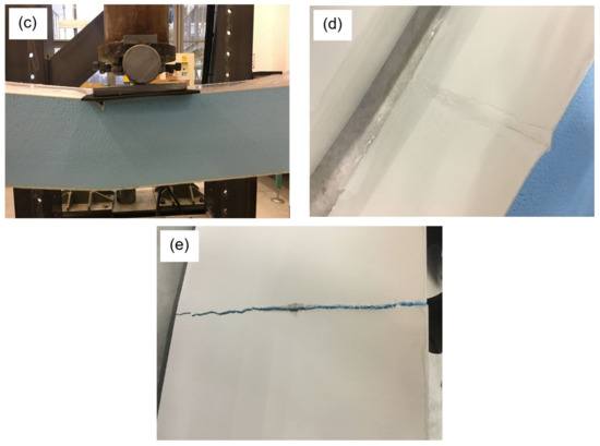A total number of three specimens (named T1, T2, and T3) are subjected to three-point bending testing. The thickness, width and length of such specimens are equal to 103 mm, 500 mm, and 2000 mm, respectively, and the span between the supports is equal to 1900 mm. In Figure 4, both specimen geometry (Figure 4a) and testing setup (Figure 4b) are shown.