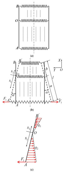The lenticular DCB is subjected to transverse tensile load F1 (shown in Figure 3), and the loaded end is gradually flattened. The lenticular DCB, model under a transverse tensile load, can be simplified into a “spring system” (shown in Figure 4a) that is continuously distributed in parallel along the length direction. The stiffness per unit length of the arc segment (the “spring” part) is k, and the bonding edge AB is approximately a rigid rod. When a transverse tension is applied at one end, there is a rotation center O (shown in Figure 4a,b), where the “spring” remains in the initial stress-free state (i.e., the “spring” remains the original length), whereas the “springs” at both ends of the center are subjected to compression (OB part) and extension (OA part), corresponding to q1 and q2, respectively.