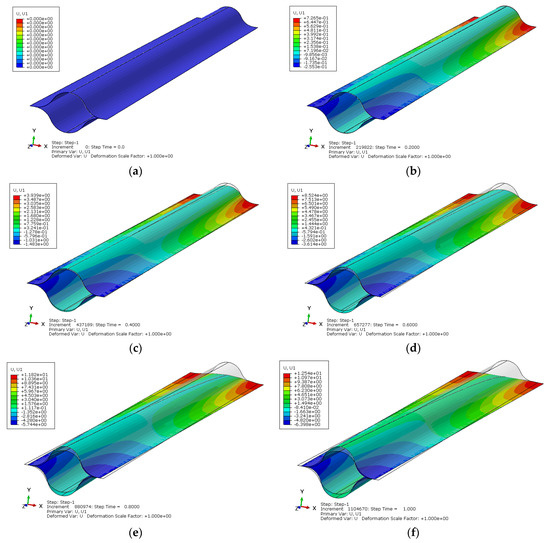 Simulated X-direction deformation of a lenticular DCB. (a) Initial state, (b) 20% of the maximum tensile deformation, (c) 40% of the maximum tensile deformation, (d) 60% of the maximum tensile deformation, (e) 80% of the maximum tensile deformation, (f) the maximum tensile deformation.