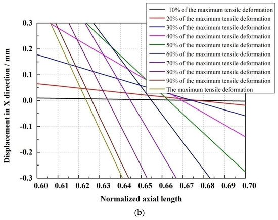 In order to obtain the neutral cross-section position of the lenticular DCB during tensile deformation, the transverse displacement of each position corresponding to the length direction (z direction) of the bonding edge is the output, and the obtained curve is shown in Figure 8. Figure 8 shows the relationship between the normalized axial length (i.e., the z direction) of the bonding edge and the displacement in the X direction under different maximum tensile deformation conditions during the tensile deformation of the lenticular DCB. As can be seen from Figure 8a, under different tensile deformation conditions, there is a position of the 0 point in the X direction displacement, which is between 0.6 and 0.7 in the length direction. The corresponding position here is the position of the neutral cross-section. From Figure 8b, with the increase in tensile deformation, the neutral cross-section position point floats within a certain range (i.e., 0.624–0.679). The normalized axial length of the neutral cross-section position point decreases with the increase in tensile deformation, but the floating range is small, as shown in Figure 9. This study mainly considers flattening caused by tension. As long as one end remains in a completely flattening state, whether caused by tension or compression, the positions of the neutral cross-section are about at 2/3 of the length. However, in the case of compression, the deviation may be larger due to the local deformation of the arc segment contacting the compressive load and due to the influence of boundary conditions.