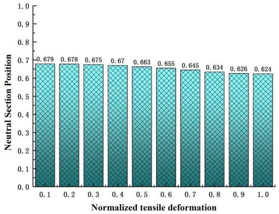 The neutral cross-section position predicted by the theoretical model is at the position 2/3 of the normalized axial length. Therefore, according to the above quantitative analysis, the relative error range between the theoretical predictions and the finite element calculations were between 6.45% and 1.80%. The theoretical predictions were in good agreement with the finite element calculations. With the increase in the tensile deformation, the prediction accuracy of the theoretical model decreased. This is because in order to facilitate the calculation and simplified analysis, a simplified model—“spring system” was proposed in this paper. The one-dimensional spring response was used to approximate the elastic response of the circular arc segment, and the bonding edge was simplified into a rigid rod. When the tensile deformation increases, the elastic deformation of the bonding edge can also affect the position of the neutral section. With an increase in the elastic deformation of the bonding edge, the position of the neutral section will move forward, which is reflected in the finite element calculation results. If the elastic deformation of the bonding edge can be considered in the theoretical model, the prediction accuracy can be improved, but the complexity of the model will be significantly increased. More detailed large deformation calculations can be analyzed with the help of finite models, referring to the methods described in the relevant literature [15,22].