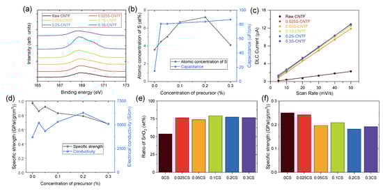 (a) S2p XPS spectra of CNTF and (b) quantitative analysis of sulfur and capacitance of the CNTF. (c) Capacitive currents of CNTF versus scan rate. (d) Specific strength and conductivity of CNTF. (e) Ratio of SnO2 and (f) specific strength of SnO2@CNTF.