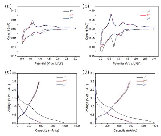 Charge/discharge tests were performed on an electrochemical station (Automatic Battery Cycler, WBCS3000L, WonaTech, Seoul, Korea,) over 0.01–2.5 V (vs. Li/Li+). CV was performed by VSP-300 electrochemical station at 0.1 mV/s scan rate over 0.01–3.0 V (vs. Li/Li+); electrochemical impedance spectroscopy (EIS) was conducted using Electrochemical Workstation ZIVE SP1 (WonaTech) over 1 MHz to 10 mHz with 5-mV amplitude.