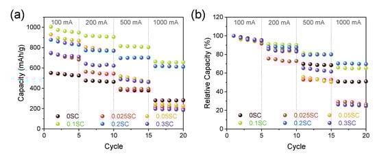 (a) Rate performance at a current density ranging from 100 mA/g to 1000 mA/g of SnO2@CNTF and (b) relative values of the capacity.