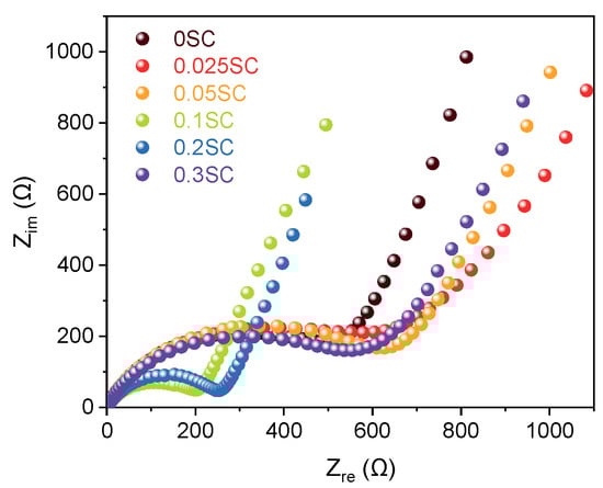 Nyquist plots obtained from EIS of the SnO2@CNTF anodes provided information on the electrochemical behavior including solution resistance, charge transfer resistance, and Warburg impedance []. All samples exhibited similar solution resistance and Warburg impedance obtained by the slope at the low-frequency region (Figure 6) []. However, the diameters of the semicircles in the high-frequency region, corresponding to the charge transfer resistance at the interface between electrode and electrolyte, varied widely. Here, the results were also divided into three groups, as discussed above. The 0.1SC and 0.2SC showed obvious small resistance, indicating favorable charge transfer kinetics. It was well correlated with the high capacity and rate capability of the two anodes. We considered that the uniform and thin SnO2 coating on CNT bundles induced low charge transfer resistance of 0.1SC and 0.2SC. The charge transfer resistances of 0.025SC, 0.05SC, and 0.3SC were larger than 0SC as well as 0.01SC and 0.02SC. Considering that the 0.025SC, 0.05SC, and 0.3SC showed lower rate capability than 0SC, the Nyquist plots were in good agreement with the rate capability.