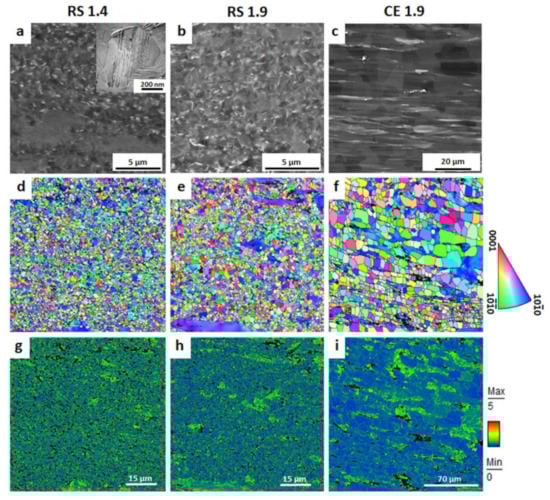 Initial microstructure of RS ribbon-consolidated alloys (RS 1.4 and RS 1.9) and cast-extruded alloy (CE 1.9) obtained by SEM: (a–c) BSE images, (d–f) orientation mapping, and (g–i) KAM mapping. All micrographs are taken on a longitudinal section with ED oriented horizontally. The color designation is in ED, i.e., original EBSD maps are rotated toward ED.