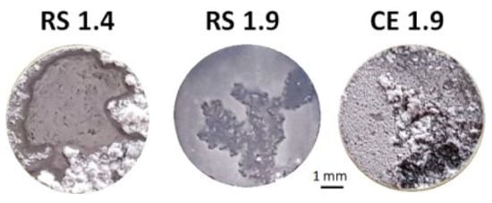 The surface morphology of the specimens after 72 h of immersion indicated that both RS alloys have better corrosion resistance compared with CE 1.9, Figure 2. The extent of corrosion on the surface of CE 1.9 was significantly larger than that for RS specimens.