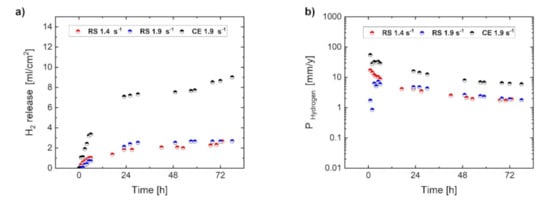 Evolution of H2 release (a) and corrosion rate (PHydrogen) (b) for RS 1.4, RS 1.9, and CE 1.9 specimens during immersion in 3.5 (w/v) % NaCl solution.