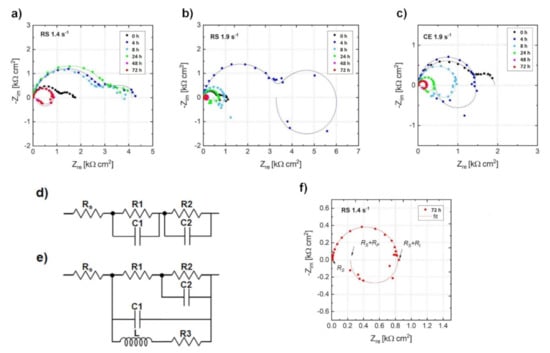 Fitted Nyquist plots for the (a) RS 1.4, (b) RS 1.9, and (c) CE 1.9 alloys immersed in 3.5 w/v % NaCl solution saturated with Mg(OH)2, using the equivalent circuits (d,e). The typical Nyquist plot (f) for the RS 1.4 immersed in a 3.5 w/v % NaCl solution saturated with Mg(OH)2 for 72 h with respect to the equivalent circuit shown in (e).