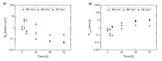 Corrosion resistance (Rp) (a) and corrosion rate (PEIS) (b) for RS 1.4, RS 1.9 and CE 1.9 specimens estimated from electrochemical impedance spectroscopy (EIS) during immersion in 3.5 (w/v) % NaCl solution.