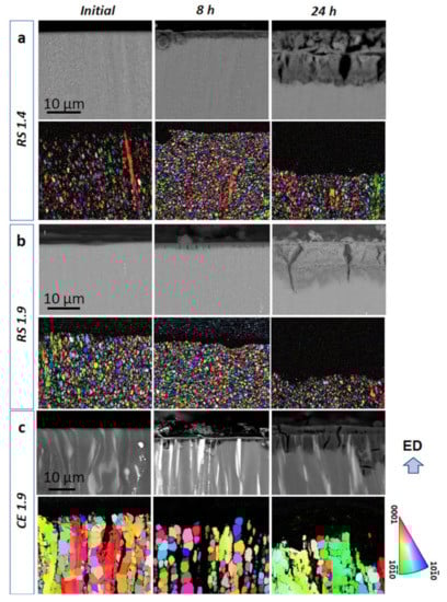 Therefore, the cross-section of the corrosion layer after immersion for 8 and 24 h was investigated using BSE imaging and EBSD mapping (see Figure 6). Such a blend of composition- (BSE) and grain morphology related information can help to find the link between the microstructure and corrosion behavior. It can be seen in BSE images (second column in Figure 6a,b) that after 8 h of immersion, a thin corrosion layer was formed on the surface of the RS 1.4 and RS 1.9 specimens, while the surface layer was significantly thicker for the CE 1.9 specimen (cf. Figure 6c). After 24 h of immersion (third column in Figure 6), the thickness of the corrosion layer increased for all three specimens (note that the real thickness of the corrosion layer for CE 1.9 is supposed to be larger than that shown, since part of the layer is continuously exfoliating from the specimen surface). Nevertheless, the average thickness of the layer formed on the surface of RS 1.4 was the same throughout the entire specimen surface, indicating a homogeneous formation and growth of the layer. In the case of the RS 1.9 specimen, the thickness of the layer varied and, in some places, the corrosion propagated deeper into the specimen volume by the LPSO lathes (cf. non-indexed black areas in the EBSD image in Figure 6b), which are supposed to be weak sites for corrosion in this specimen.