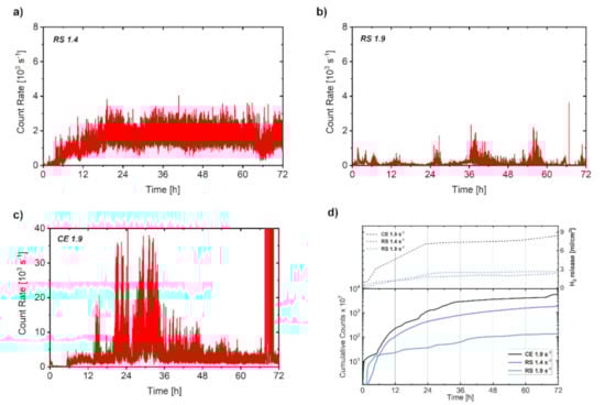 Analysis of the AE response: AE count rate (a–c for RS 1.4, RS 1.9, CE 1.9, respectively) and (d) cumulative counts correlated with the evolution of H2 release during immersion of in a 3.5 (w/v) % NaCl solution. Please note the different scale for the AE count rate in (a–c).