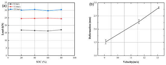 - Under quasi-static load, the carrying capacity of the battery is in the range of 6–8 kN, which varies slightly with the SOC. In contrast, the peak transient load capacity of the battery exceeds 15 kN under dynamic impact load.