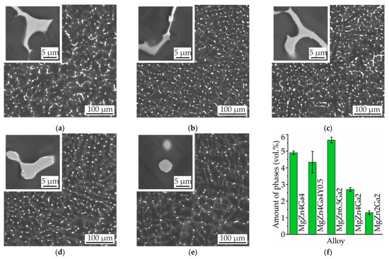 SEM micrographs of (a) MgZn4Ga4, (b) MgZn4Ga4Y0.5, (c) MgZn6.5Ga2, (d) MgZn4Ga2, and (e) MgZn2Ga2. (f) Amounts of intermetallic phases (Mg7Zn3, Mg5Ga2, and GaY) in the alloys after T4 heat treatment.