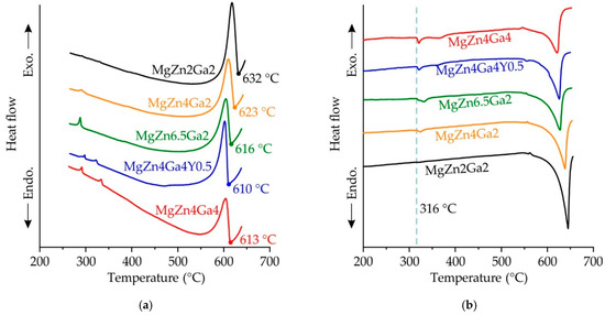 The DSC analysis results are shown in Figure 3. The liquidus temperatures were determined from the DSC cooling curves, and the corresponding results are presented in Figure 3a. Notably, the liquidus temperature of the alloys decreased with increasing concentration of the alloying elements. Conversely, the solidus temperature of all of the investigated alloys was 316 °C, which was obtained from the DSC heating curves (Figure 3b). This solidus temperature value was close to that obtained for MgZn4Ga4 (307 °C) in our previous study [5]. As mentioned before, both the Ga- and Zn-rich eutectic phases were observed in the microstructural and EDS analyses of the alloy samples; based on these results, the solidus temperature (316 °C) could be associated with the formation of the L→α-Mg+Mg7Zn3+Mg5Ga2 ternary eutectic.