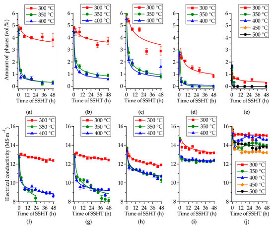 Amounts of intermetallic phases (Mg7Zn3, Mg5Ga2, and GaY) (a–e) and electrical conductivity (f–j) of the Mg–Zn–Ga alloys: (a,f) MgZn4Ga4, (b,g) MgZn4Ga4Y0.5, (c,h) MgZn6.5Ga2, (d,i) MgZn4Ga2, and (e,j) MgZn2Ga2, during SSHT at different temperatures.