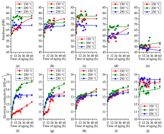 Brinell hardness (a–e) and electrical conductivity (f–j) of the Mg–Zn–Ga alloys: (a,f) MgZn4Ga4, (b,g) MgZn4Ga4Y0.5, (c,h) MgZn6.5Ga2, (d,i) MgZn4Ga2, and (e,j) MgZn2Ga2 during aging at different temperatures (18 h at 450 °C for MgZn2Ga2, and 18 h at 350 °C for other alloys) after SSHT.