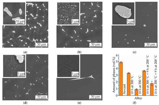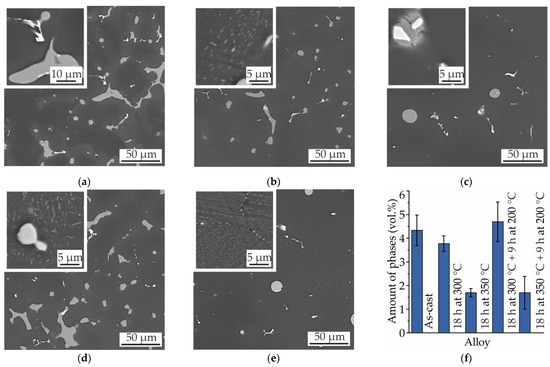 SEM micrographs of MgZn4Ga4: (a) as-cast; after T4 heat treatment: (b) 18 h at 300 °C, (c) 18 h at 350 °C; and after T6 heat treatment: (d) 18 h at 300 °C and 9 h at 200 °C, (e) 18 h at 350 °C and 9 h at 200 °C; and (f) the amount of intermetallic phases (Mg7Zn3 and Mg5Ga2) in these conditions.