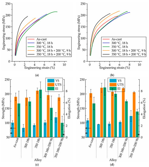 (a,b) Engineering stress–strain curves and (c,d) mechanical properties (YS: yield strength; UTS: ultimate tensile strength; El: elongation at fracture) obtained during the tensile testing of the as-cast and heat-treated (a,c) MgZn4Ga4 and (b,d) MgZn4Ga4Y0.5.