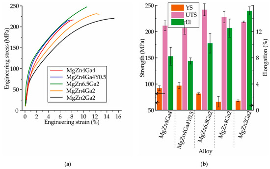(a) Engineering stress–strain curves and (b) mechanical properties (YS: yield strength; UTS: ultimate tensile strength; and El: elongation at fracture) obtained during the tensile testing of the T4 heat-treated Mg–Zn–Ga alloys.