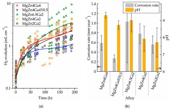 The amount of H2 released during the 192 h immersion corrosion testing of the Mg–Zn–Ga alloys in Hanks’ solution after 18 h of SSHT at 350 °C (450 °C for MgZn2Ga2) is shown in Figure 11a. Evidently, the amount of released H2 varied significantly for the alloy samples; consequently, a large number of samples were used for the corrosion test. The calculated corrosion rate (CR) of the investigated alloys and the pH of corrosive media (Hanks’ solution) measured at the end of the corrosion tests are shown in Figure 11b. These results show that the addition of 0.4 wt.% Y to MgZn4Ga4 decreased its CR from 0.59 to 0.27 mm/year, i.e., it more than halved the initial CR. For the alloys with a Zn/Ga ratio (wt.%) close to 1, the corrosion rate was approximately the same, i.e., ~0.6 mm/year. When the Zn/Ga ratio was increased to 2 and 3.25 while the Zn content in the alloys was higher, their CR increased to 0.78 and 1.03 mm/year, respectively. The pH of the corrosive media for the high-alloyed MgZn4Ga4, MgZn4Ga4Y0.5, and MgZn6.5Ga2 was close to 9 after 192 h of corrosion testing, while that of the low-alloyed MgZn4Ga2 and MgZn2Ga2 was close to 8. In general, a higher CR is proportional to a higher pH value of the medium; however, this trend was not observed in our results [34,35]. At the same time, it can be seen that pH is higher for high-alloyed alloys, and it is possible that the content of Zn and Ga in the medium affects its pH.