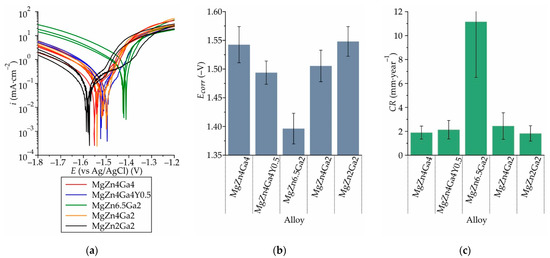 (a) Polarization curves, (b) corrosion potential (Ecorr), and (c) corrosion rate (CR) obtained via electrochemical corrosion testing of the T4 heat-treated Mg–Zn–Ga alloys in Hanks’ solution at 37 °C.