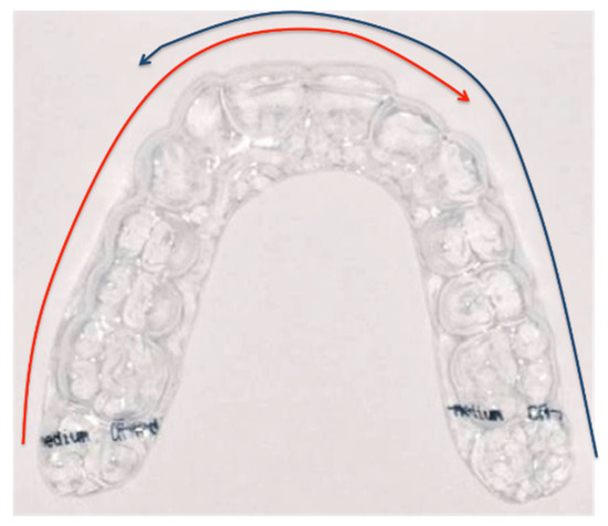 At T0, the samples were numbered and weighed using precision scales (±0.01 g, DIPSE. TP-500), then optically scanned (CS 3600 Intra-Oral Scanner (IOS), Carestream Dental, Rochester, NY, USA), according to a precise scanning protocol. Three outer surfaces were considered for scanning purposes: the vestibular; the occlusal/incisor margin; and the lingual palatal tooth side The inner surface of the aligners was not scanned. The scanning technique (Figure 1) covered the teeth from the left lateral incisor to the right second molar, and from the right lateral incisor to the left second molar [16].