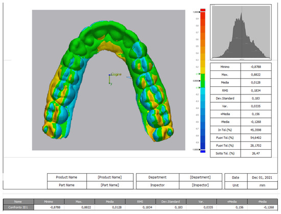 The optical scan obtained dimensional differences between observation times (Geomagic Design X Control 3D System) used the value at T0 for reference and imported the scan obtained at T2. The software tools enabled a manual (mesh-based) alignment of the two objects (the scans of the aligners) to obtain the first result. Then, using 3D comparison software (a subprogram of Geomagic Design), the two 3D scans were superimposed (Figure 2). The resulting report provided the mean overlap and its standard deviation, in mm, for each aligner.