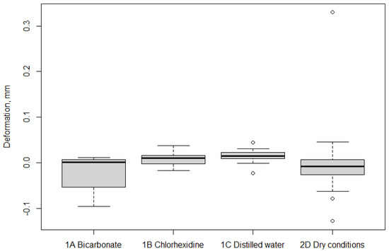 Deformation data profiles of the four groups: bicarbonate (1A), chlorhexidine (1B), distilled water (1C), and dry conditions (2D). Box and whiskers plot.