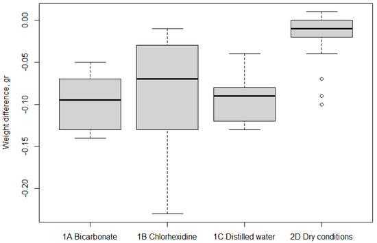 Weight difference in the four groups: bicarbonate (1A), chlorhexidine (1B), distilled water (1C), and dry conditions (2D). Box and whiskers plot.