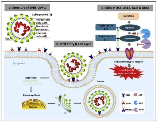 Structural component of the novel SARS-CoV-2 and mode of host penetration. (a) SARS-CoV-2 is composed of the viral RNA and structural proteins (S, E, M, N) that are shared amongst the CoV family; (b) viral entry and life cycle into the host; and (c) the roles of angiotensin-converting enzyme (ACE), ACE-2, ACE inhibitors (ACEIs), and angiotensin receptor blockers [21].