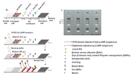 LFAs can be incorporated with other techniques and synergistically increase their sensitivity and LOD. For example, a one-step RT-LAMP amplification coupled with SA-DNPs-based LFA (RT-LAMP-LFA) was developed for the detection of SARS-CoV-2 genes. LAMP primers for the ORF1ab and N genes of SARS-CoV-2 were simultaneously amplified in a single-tube reaction, and the results were quantified on a LFA test strip (Figure 3). The LOD of the SARS-CoV-2 RT-LAMP-LFA was 12 virus copies/25 µL reaction. The tests showed 100% sensitivity and specificity when used in COVID-19 clinical samples [86], whereas the commercially available LightMix Modular SARS-CoV RT-PCR had a 78.6% sensitivity [106].