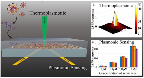 Gold nanoislands (AuNIs) have been used for the development of plasmonic photothermal (PT) biosensors for detection of SARS-CoV-2 RNA sequences by targeting the E, RdRp, and the ORF1ab genes [88]. Due to their optical properties [112,113], MNPs produce heat when collective oscillations in the electron density at the surface of nanostructures arise via coupling to electromagnetic waves [114]. The amplified movement of the conduction electrons increases the frequency of collisions with the lattice atoms, resulting in the production of PT-induced heat. The above-mentioned dual-function plasmonic biosensor combines the AuNI’s PT effect and LSPR sensing transduction induced by hybridization of the cDNA complementary to the SARS-CoV-2 RNA target sequences (Figure 4). The thermoplasmonic heat (at 41 °C) on the AuNI chip induced in situ hybridization and discriminated between two similar gene sequences (RdRp genes from SARS-CoV versus SARS-CoV-2). The sensor exhibited high sensitivity, with a LOD of 0.22 pM [88].