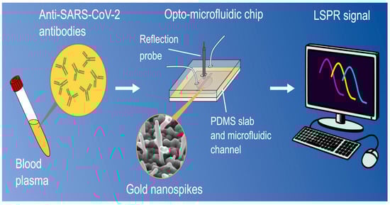 Gold nanospike-based opto-microfluidic sensor for the detection of anti-SARS-CoV-2. Human plasma containing the SARS-CoV-2 antibodies was collected in a tube. The blood plasma is laid on the opto-microfluidic chip that is electrodeposited with gold nanospikes. The shift in the LSPR of gold nanospikes is correlated with the amount of target antibodies [89].